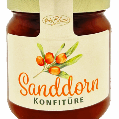 2er Pack Konfitüre/Gelee 2 x 250gr, Sanddornkonfitüre: Sanddornbeeren, Zucker, Glukosesirup, Säureregulator, Geliermittel: Pektin,